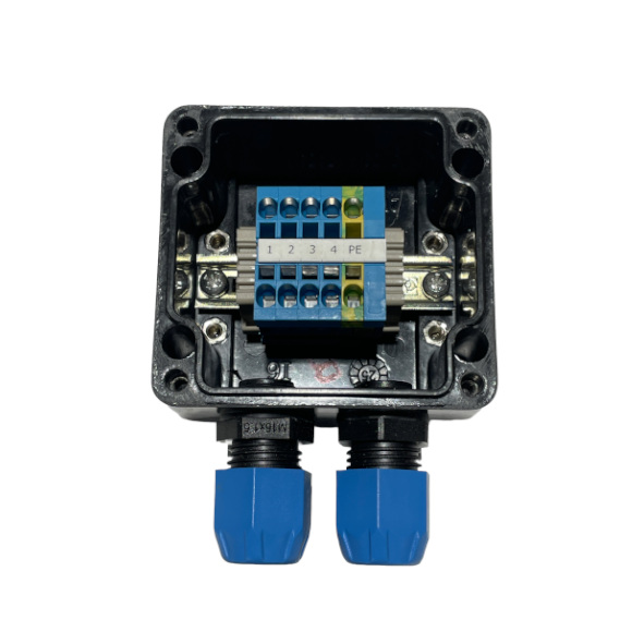 Ces boîtes disposent de 2 entrées de câble avec des presse-étoupes bleus en polyamide M16x1,5 et sont équipées de 4 bornes bleues de 2,5mm2 + 1 borne de terre.