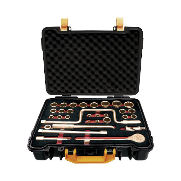 Jeu de clés à douilles anti-étincelles 1/2” et 12 points, en alliage de Cuivre-Béryllium (Cu-Be) ou d’Aluminium-Bronze (Al-Bron), utilisables dans les zones à risque d’explosion.